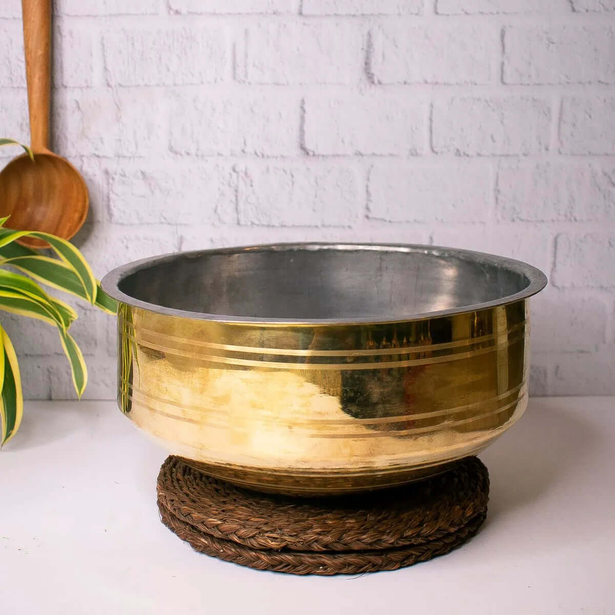 Sarva shaped brass cookware is typically wide mouth with a wider rim to cook vegetables, curries that generally form part of daily diet.